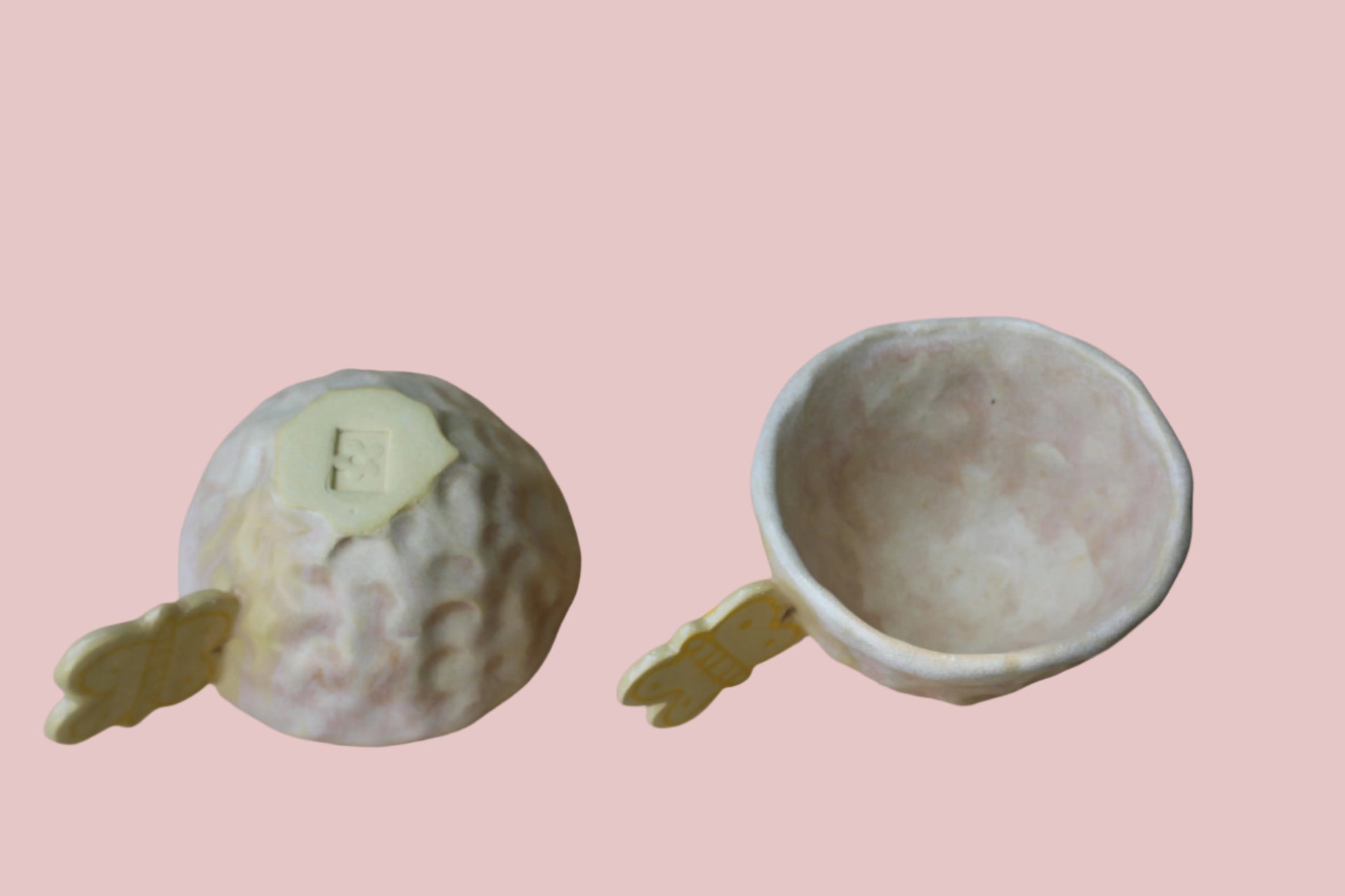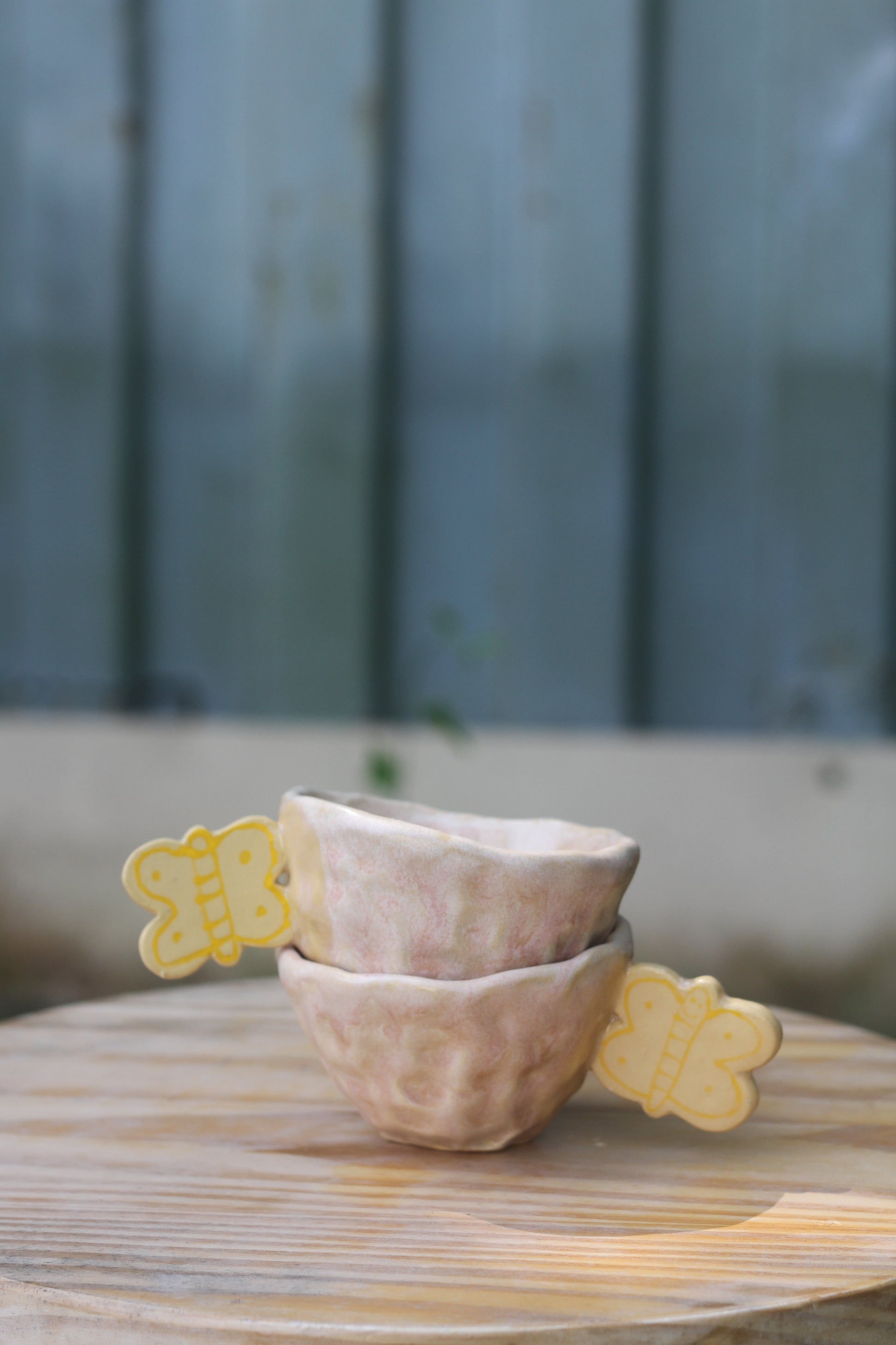 This cutie holds 4 ounces of your favorite drink, but I would recommend tea, a cortado, or sipping some wine with your friends! The cup is made via pinched pot, stippled for a playful take, and a tiny butterfly is attached to grip. I love this cup, and keep one at my house at all times. <3