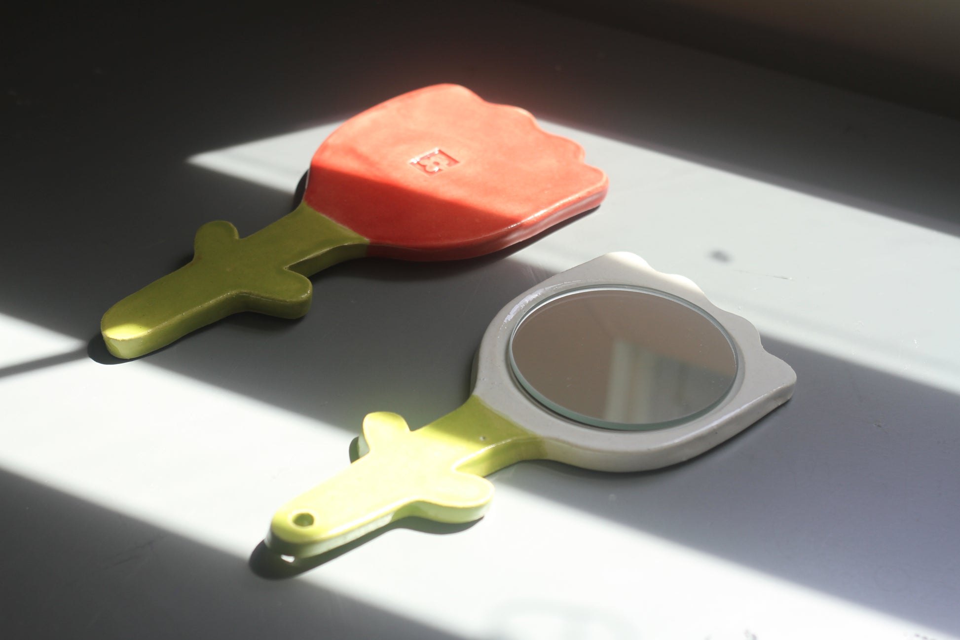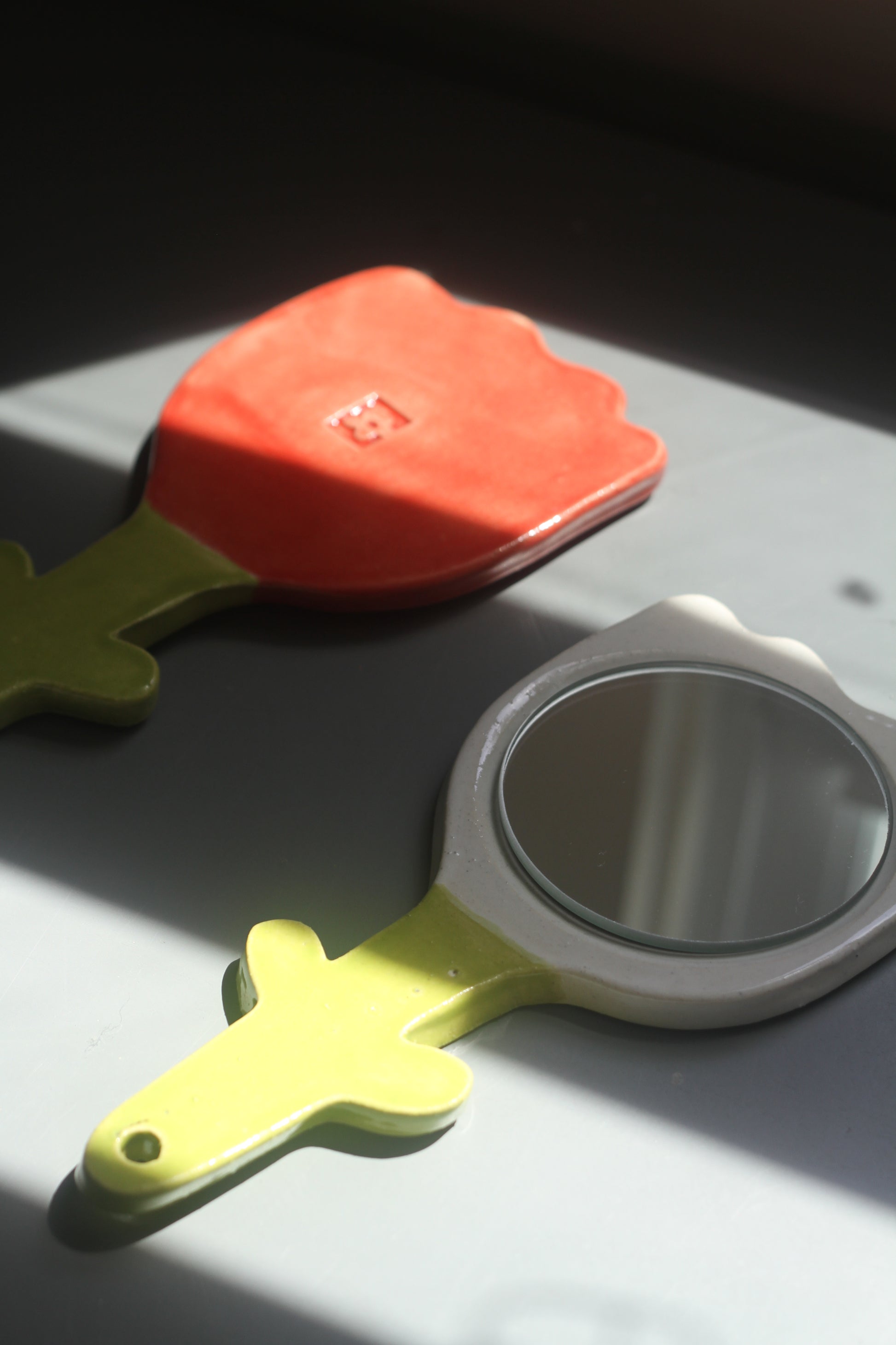 Hand built hand-mirror in the shape of the cutest little flower ever. All hand mirrors are hand made with love which makes each one special and unique. All mirrors come with a hole, so that you may hang it if you'd like. Available in three colors, orangey-red, white, & light yellow.